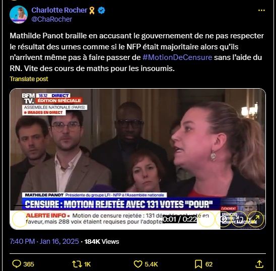 Mathilde Panot braille en accusant le gouvernement de ne pas respecter le résultat des urnes comme si le NFP était majoritaire alors qu’ils n’arrivent même pas à faire passer de #MotionDeCensure sans l’aide du RN. Vite des cours de maths pour les insoumis.