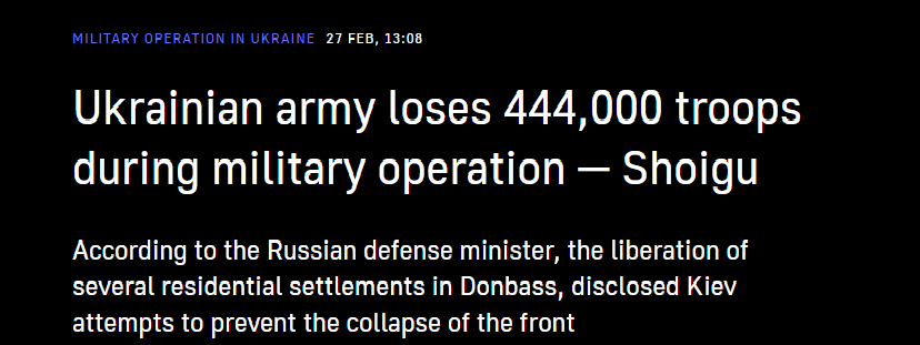 MOSCOU, le 27 février. /TASS/. L'armée ukrainienne a perdu plus de 444 000 soldats depuis le début de l'opération militaire spéciale et a perdu quotidiennement plus de 800 soldats et 120 armements divers depuis le début de 2024, a déclaré le ministre de la Défense Sergueï Choïgou lors de la réunion du conseil d'administration du ministère de la Défense.