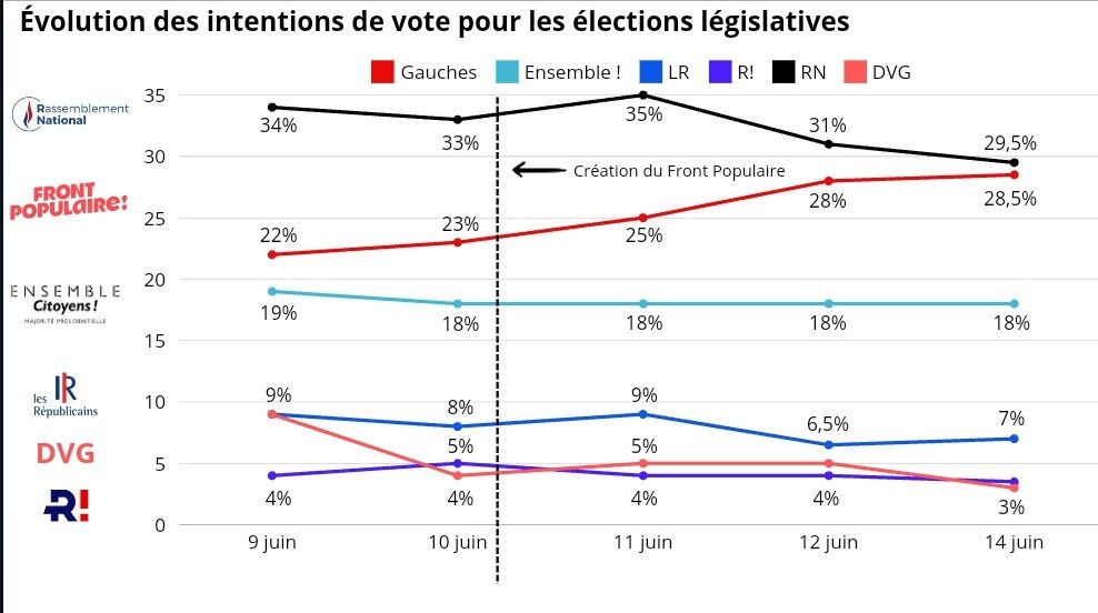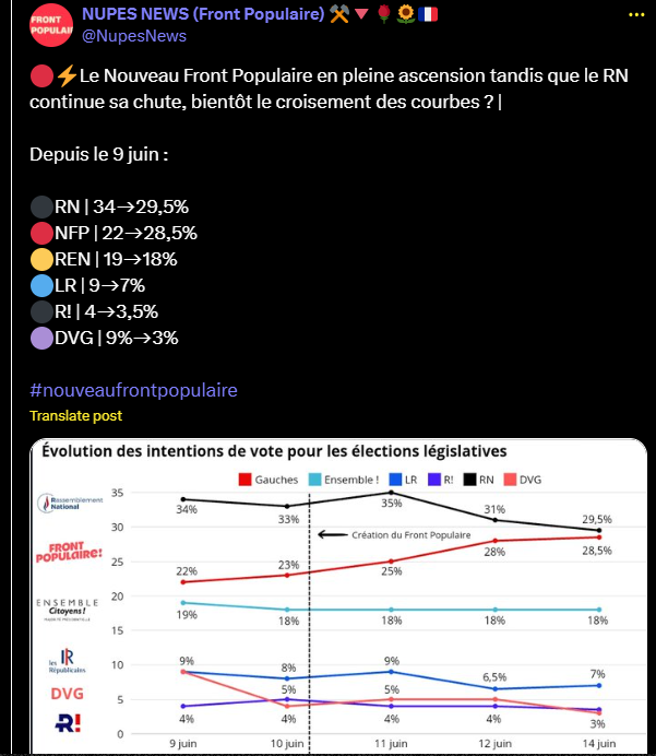 🔴⚡Le Nouveau Front Populaire en pleine ascension tandis que le RN continue sa chute, bientôt le croisement des courbes ? |