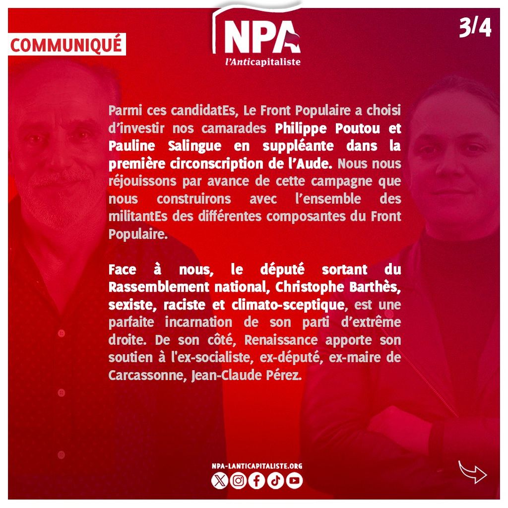 Parmi ces candidatEs, Le Front Populaire a choisi d’investir nos camarades Philippe Poutou et Pauline Salingue en suppléante dans la 1è circonscription de l’Aude.