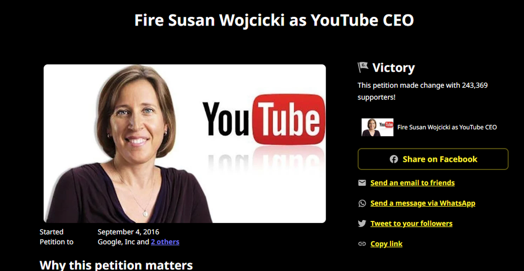 Depuis février 2014, Susan Wojcicki est devenue directrice générale (PDG) de YouTube, qui fait partie de Google. Sous sa direction, les choses ont commencé à se détériorer et ont terni la réputation de YouTube et de Google, de la controverse sur les droits d'auteur au cauchemar controversé des relations publiques de YouTube en 2016, connu sous le nom de politique de monétisation favorable à la publicité, qui a été sévèrement critiquée par divers YouTubers, affirmant que les nouvelles règles censuraient et faisaient taire les YouTubers.