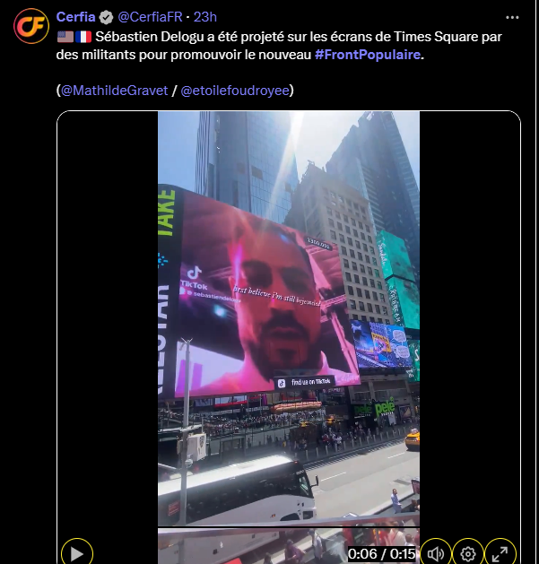 🇺🇸🇫🇷 Sébastien Delogu a été projeté sur les écrans de Times Square par des militants pour promouvoir le nouveau #FrontPopulaire.