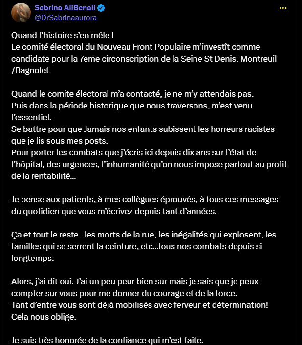 Le comité électoral du Nouveau Front Populaire m’investît comme candidate pour la 7eme circonscription de la Seine St Denis. Montreuil /Bagnolet