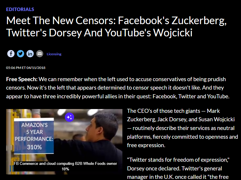 Liberté d’expression : on se souvient de l’époque où la gauche accusait les conservateurs d’être des censeurs prudes. Aujourd’hui, c’est la gauche qui semble déterminée à censurer les discours qui ne lui plaisent pas. Et ils semblent avoir trois alliés incroyablement puissants dans leur quête : Facebook, Twitter et YouTube.