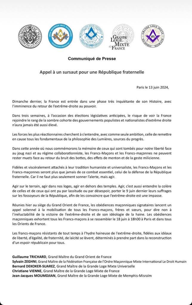 Vive le Front Populaire, allons-y, il est temps. Le RN est la haine, il faut absolument faire barrage, j'en appelle à tous les maçons.