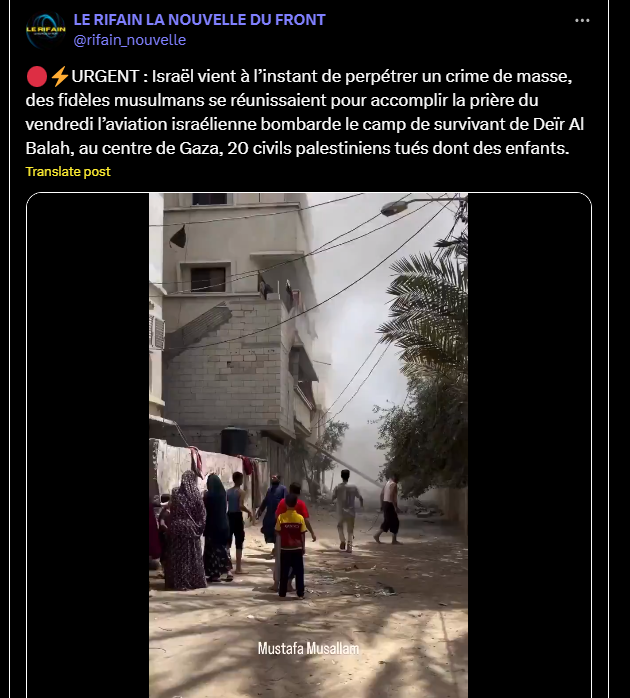 🔴⚡️URGENT : Israël vient à l’instant de perpétrer un crime de masse, des fidèles musulmans se réunissaient pour accomplir la prière du vendredi l’aviation israélienne bombarde le camp de survivant de Deïr Al Balah, au centre de Gaza, 20 civils palestiniens tués dont des enfants.