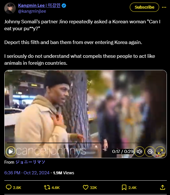 Johnny Somali's partner Jino repeatedly asked a Korean woman "Can I eat your pu**y?"