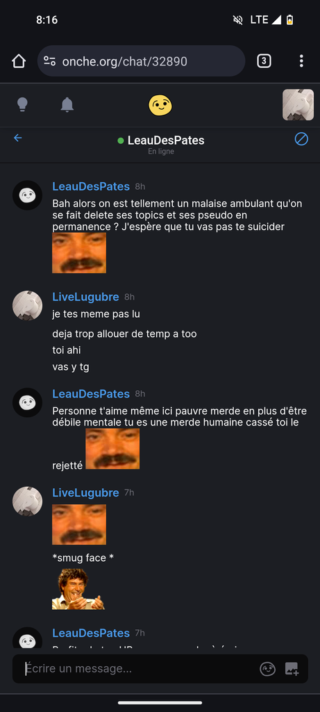 C'était ce midi avant que je prenne l'avion ouient, par contre montre toutes les autres conversation et leur debut, toujours toi qui vient me parler en mp ayaaaa
