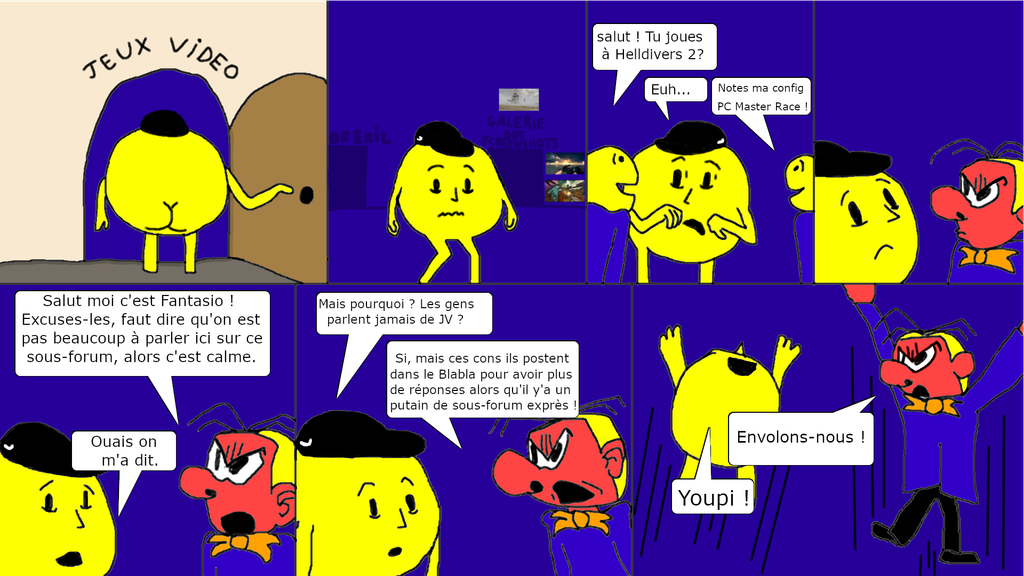 C'est sincèrement incroyablement drôle khey j'adore toutes les refs. Même le welcum m'a fait rire. J'adore les dessins et les couleurs. Ça doit te prendre un temps fou.