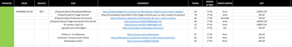 Je ne bosse pas à l’échec sauf quand j'augmente le poids, je note LIMITE GP (garder poids) quand je ne passe pas les 5x10 reps. Une fois que je passe les 5x10 proprement je monte en poids (MP) sinon je met GP quand c'est limite mais que je passe quand même les 10