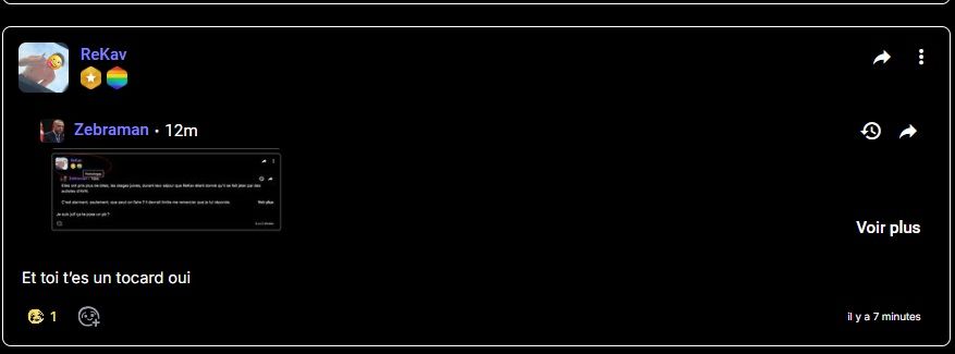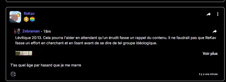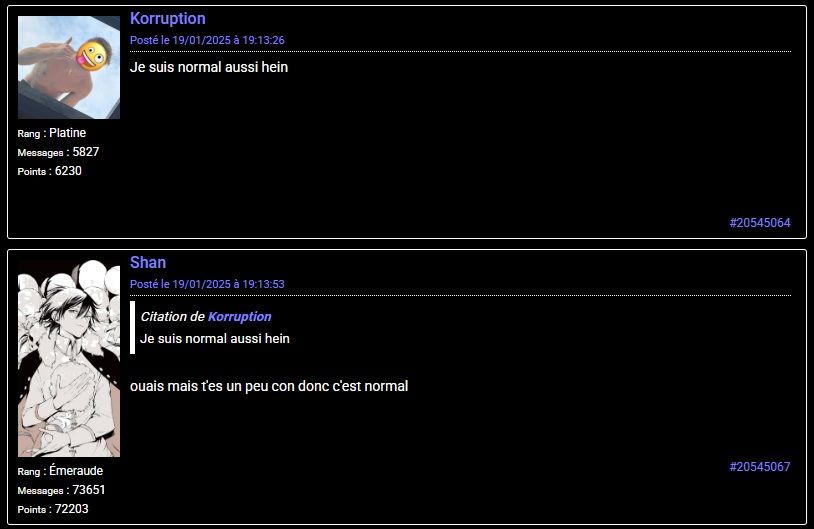 "Puceau mental" mdr, j'ai juste plus de retenu que toi + stop prendre la mouche pour rien, j'ai pas été belligérant mais j'pense que quelque part tu te sais fautif, c'est donc pour ça que tu te braques autant