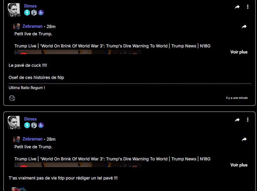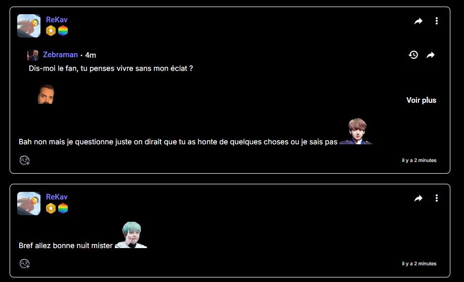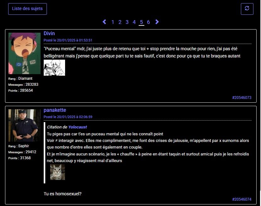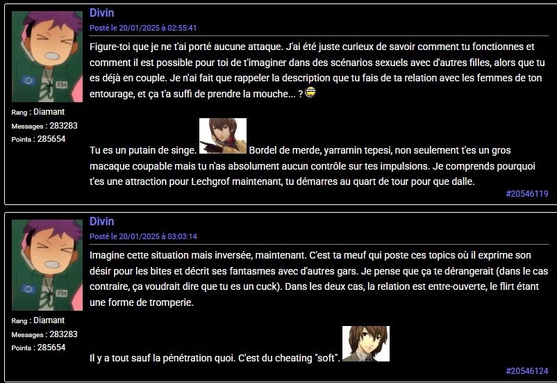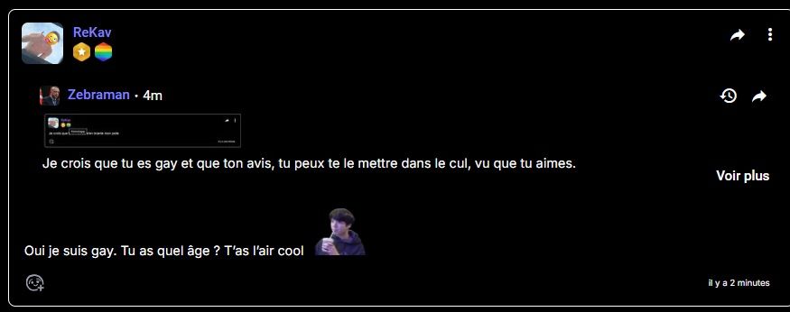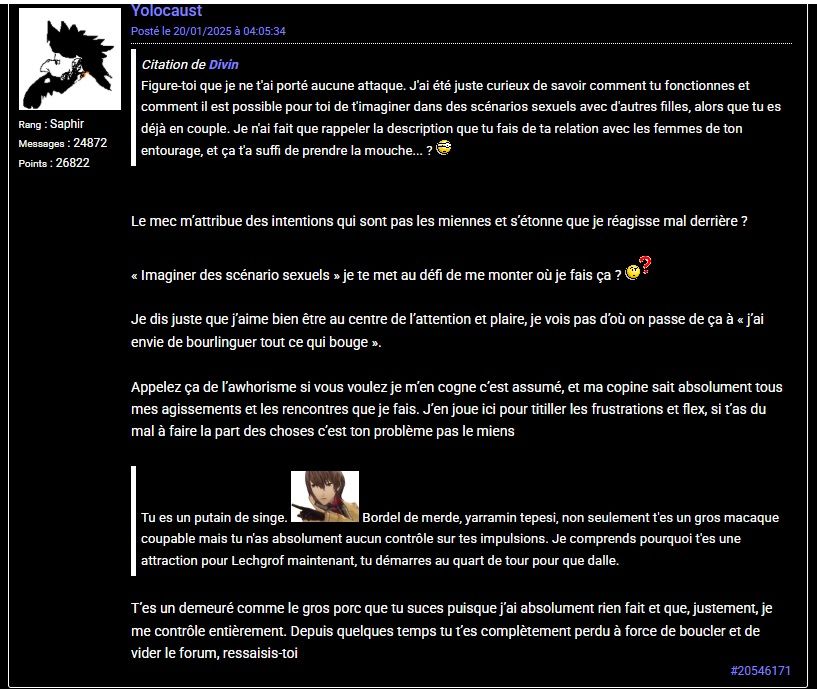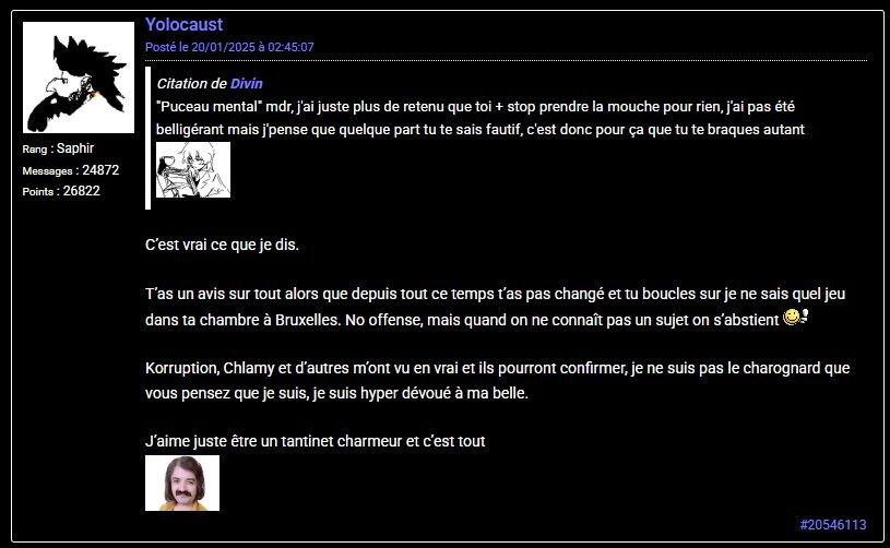 "Puceau mental" mdr, j'ai juste plus de retenu que toi + stop prendre la mouche pour rien, j'ai pas été belligérant mais j'pense que quelque part tu te sais fautif, c'est donc pour ça que tu te braques autant