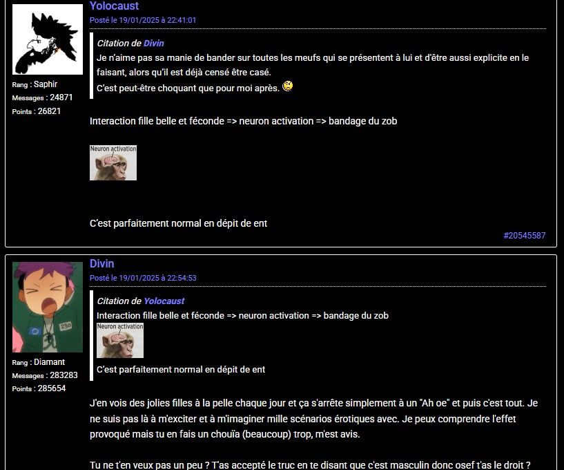 T’es un demeuré comme le gros porc que tu suces puisque j’ai absolument rien fait et que, justement, je me contrôle entièrement. Depuis quelques temps tu t’es complètement perdu à force de boucler et de vider le forum, ressaisis-toi