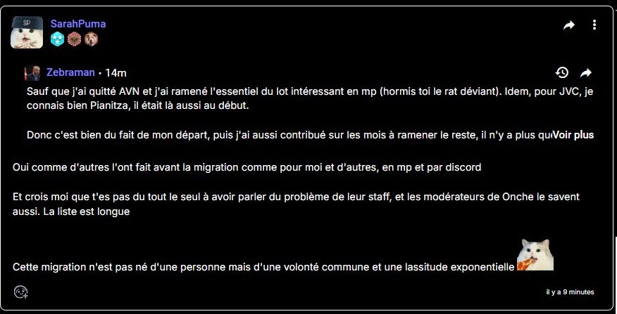 Donc c'est bien du fait de mon départ, puis j'ai aussi contribué sur les mois à ramener le reste, il n'y a plus que des déchets là-bas. De plus, oui, j'ai déjà souligné le problème du staff AVN et plusieurs modérateurs d'Onche le savent.