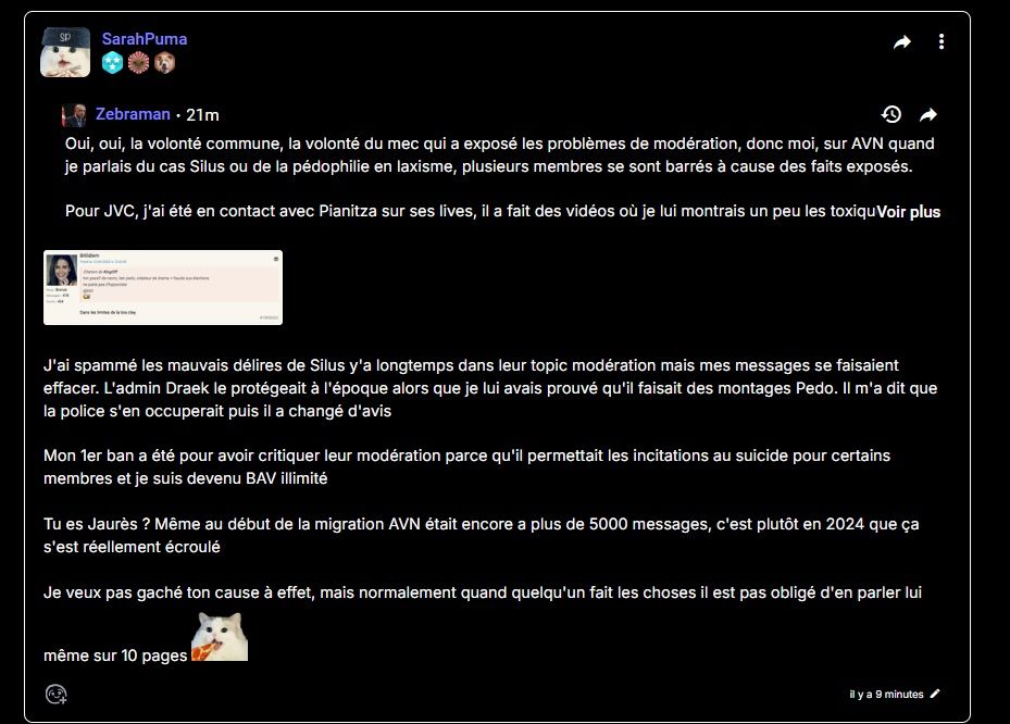 Oui, oui, la volonté commune, la volonté du mec qui a exposé les problèmes de modération, donc moi, sur AVN quand je parlais du cas Silus ou de la pédophilie en laxisme, plusieurs membres se sont barrés à cause des faits exposés.