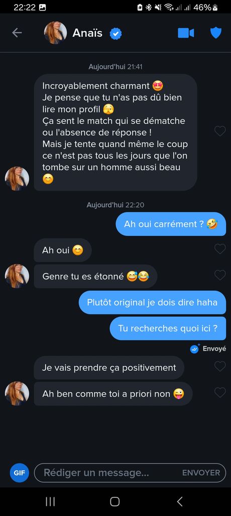 En gros j'ai donné rdv à une 8/10 de Tinder dans un bar au centre-ville (le tout enregistré de manière éco+), au début j'hésitais à rentrer dans le bar mais avec le soutien du fofo j'y suis allé. Comme elle n'était pas encore arrivée je m'étais assis au fond du bar avec un petit whisky jusqu'à que je croise la charmante Andréa qui était en train de chercher le fake bg Tinder dans le bar. Je lui ai avoué que c'était fake et j'ai vu de la déception dans son regard avant qu'elle me demande de lui payer un verre par vengeance personnelle, ce que j'ai fais pour pas la brusquer. Ensuite on a discuté ensemble une bonne demi-heure avant qu'elle décide de rentrer chez elle. Avant de partir je glisse un petit "tu veux venir chez moi ?" en mode rigolade et elle refusa. Peu après un khey l'appela pour confirmer le nofake et c'est ce qui a donné le vocaroo plus haut (il y avait 3 vocaroo il me semble).