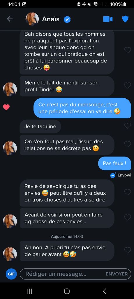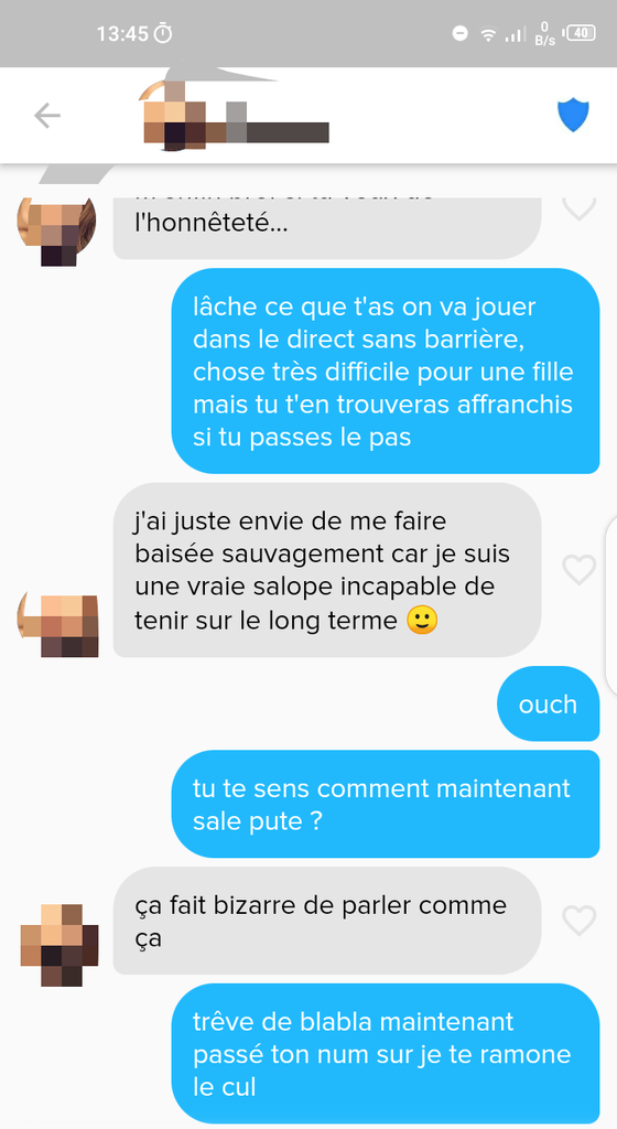 En gros j'ai donné rdv à une 8/10 de Tinder dans un bar au centre-ville (le tout enregistré de manière éco+), au début j'hésitais à rentrer dans le bar mais avec le soutien du fofo j'y suis allé. Comme elle n'était pas encore arrivée je m'étais assis au fond du bar avec un petit whisky jusqu'à que je croise la charmante Andréa qui était en train de chercher le fake bg Tinder dans le bar. Je lui ai avoué que c'était fake et j'ai vu de la déception dans son regard avant qu'elle me demande de lui payer un verre par vengeance personnelle, ce que j'ai fais pour pas la brusquer. Ensuite on a discuté ensemble une bonne demi-heure avant qu'elle décide de rentrer chez elle. Avant de partir je glisse un petit "tu veux venir chez moi ?" en mode rigolade et elle refusa. Peu après un khey l'appela pour confirmer le nofake et c'est ce qui a donné le vocaroo plus haut (il y avait 3 vocaroo il me semble).