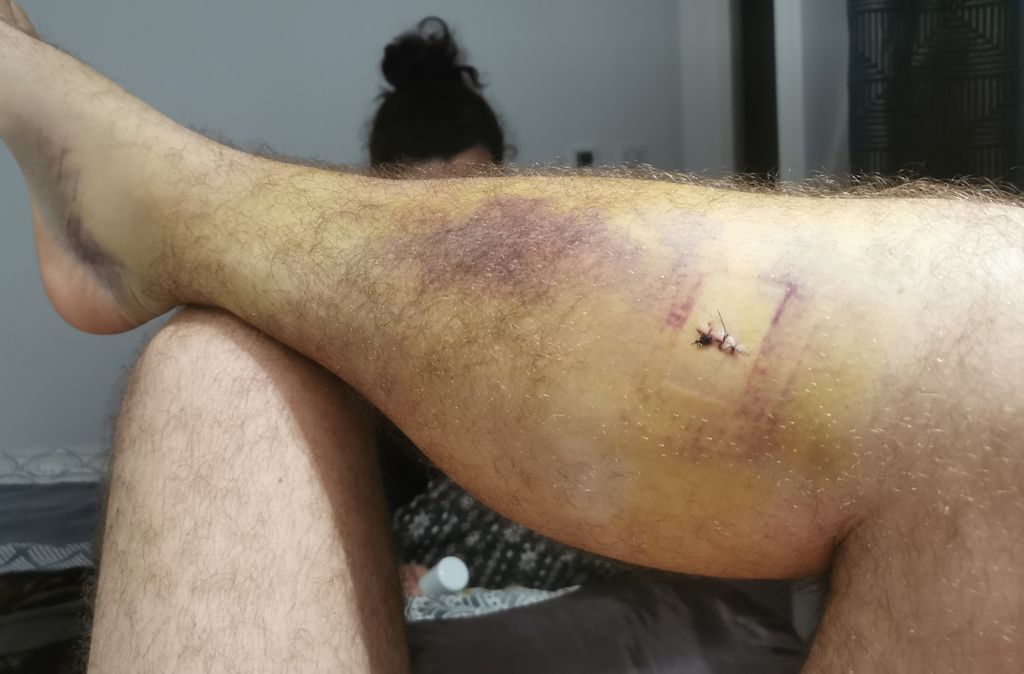 Je me suis planté un couteau dans le mollet. 4 semaines d'arrêt + bande de contention et piqûres anti-phlébite.