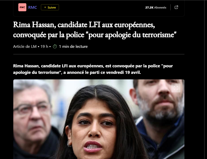 Rima Hassan, candidate LFI aux européennes, est convoquée par la police "pour apologie du terrorisme", a annoncé le parti ce vendredi 19 avril.