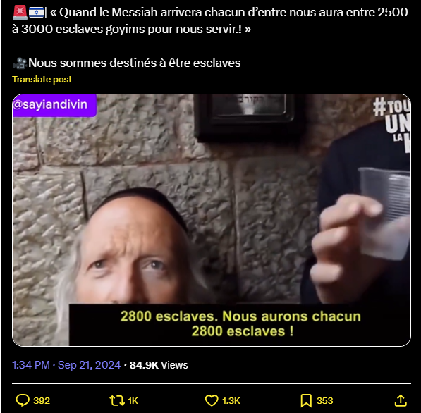 🚨🇮🇱| « Quand le Messiah arrivera chacun d’entre nous aura entre 2500 à 3000 esclaves goyims pour nous servir.! »