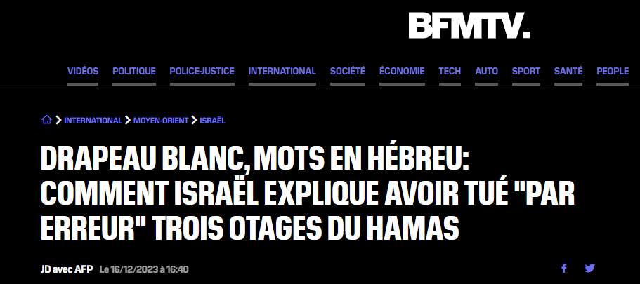 L'armée israélienne livre ce samedi 16 décembre les premiers éléments de son enquête sur la mort de trois otages tués "par erreur" par ses soldats à Gaza, expliquant qu'ils avaient brandi un drapeau blanc et appelé à l'aide en hébreu.