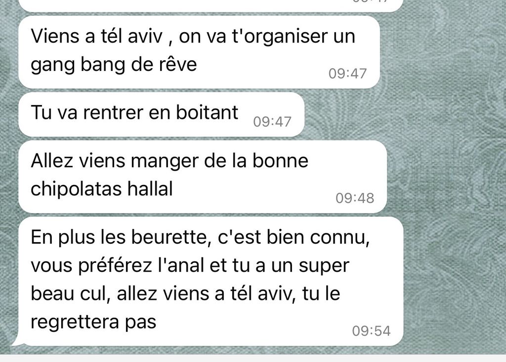 Un juif établi en France, appelle Rima pour demander si il peut la payer pour des services sexuels, il la considère comme un pute.