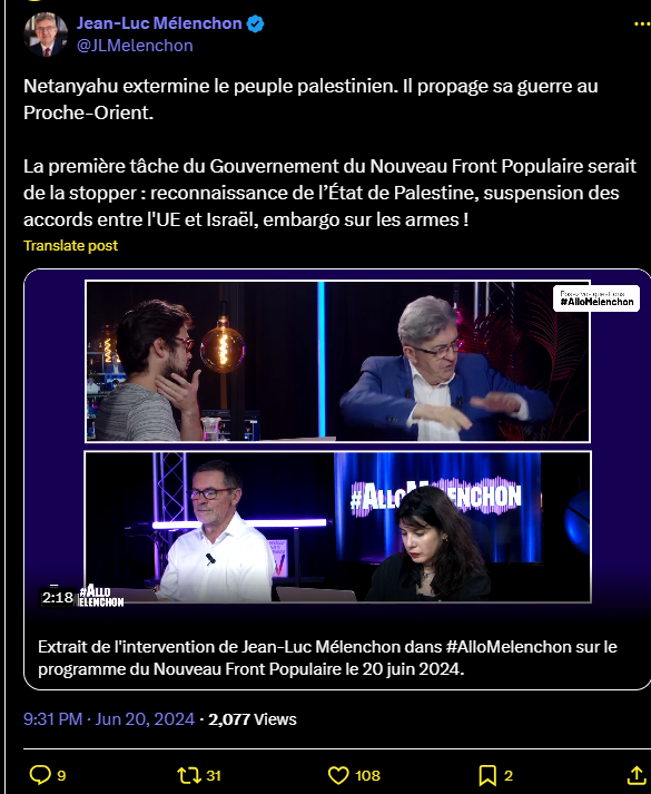 La première tâche du Gouvernement du Nouveau Front Populaire serait de la stopper : reconnaissance de l’État de Palestine, suspension des accords entre l'UE et Israël, embargo sur les armes !
