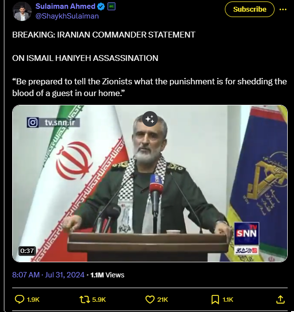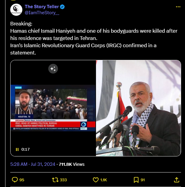 Le chef du Hamas #IsmailHaniyeh tué près de sa résidence à Téhéran en compagnie d'un de ses gardes du corps.