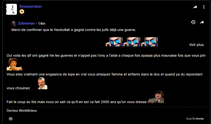 Vous etes vraiment une engeance de lope en vrai vous attaquez femme et enfants dans le dos et quand ya du repondant vous chouinez