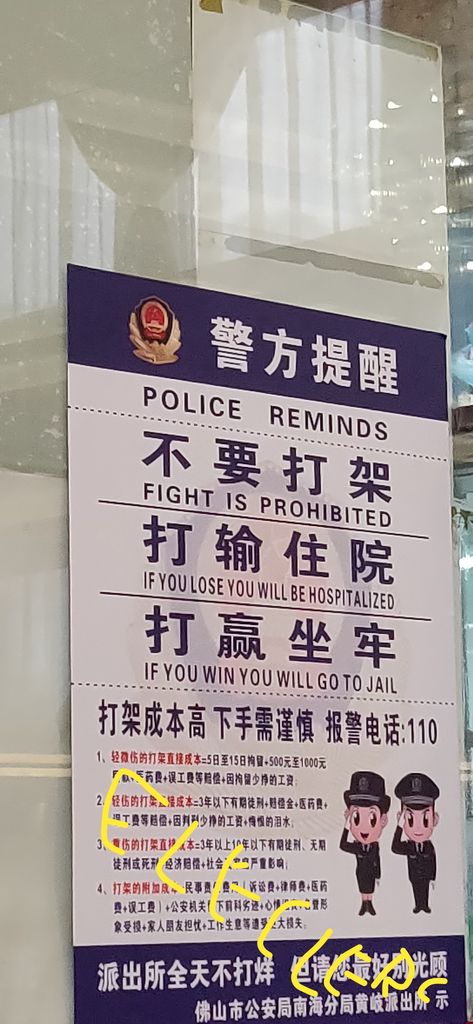 C'était dans un restaurant à la campagne. Là-bas les chinois se battent beaucoup et ddonc les autorités espèrent dissuader les paysans de se battre avec ce genre d'affiche