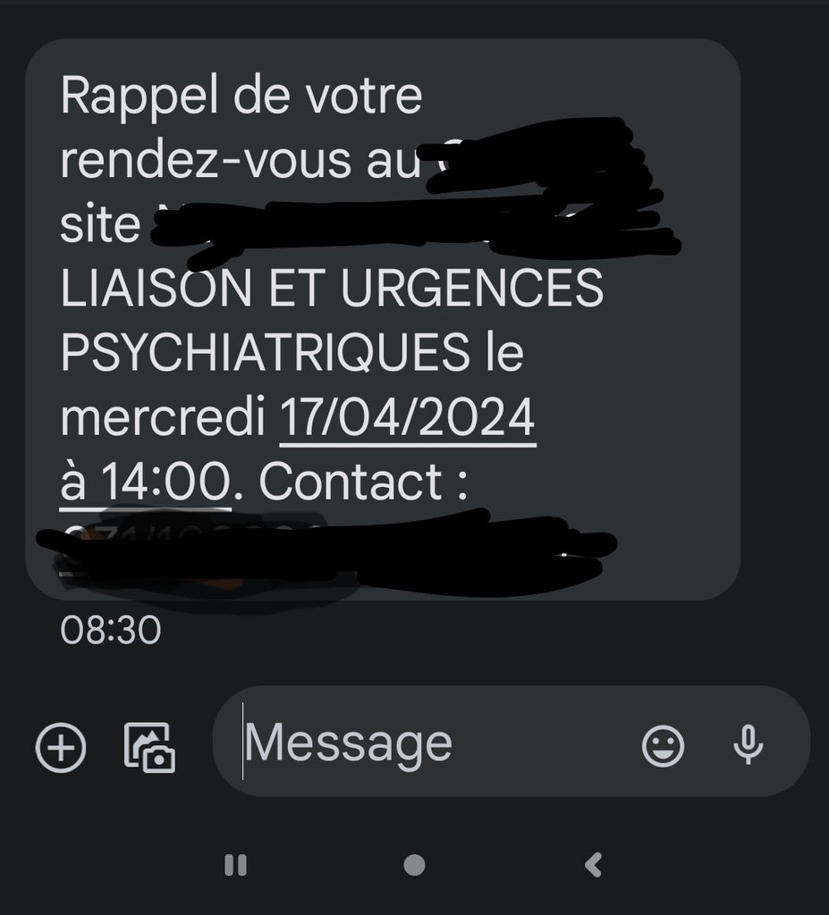 j'sais pas, j'ai vu la cellule mobile santé mentale de ma ville aujourd'hui et ils m'ont dit de parler de mon suicide assisté demain dans mon rdv de 14h pour mon internement