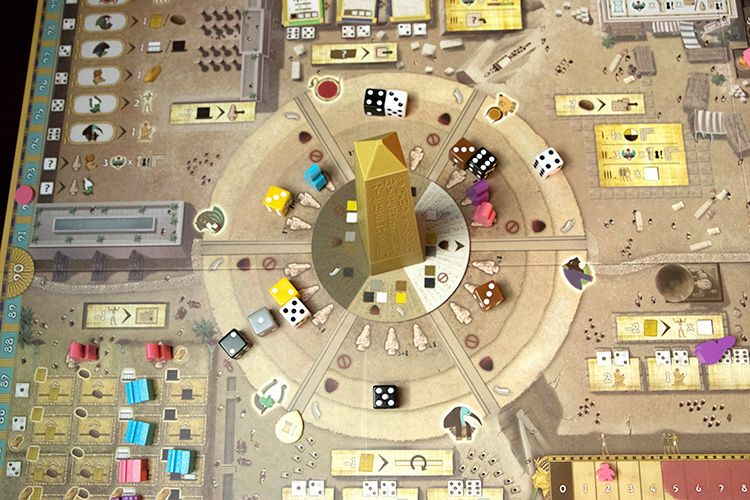 Toutes les méchaniques du jeu réside sur une DRAFT de dés avec un obélisque pivotant. La valeur des dès ayant une importance sur l'action que l'on souhaite. Au fil de la partie l'obélisique va pivoter et rendre certains dès inutilisable.