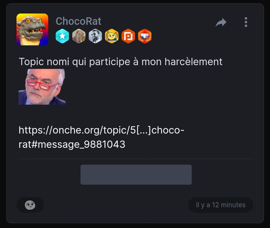 Il est d'abord venu chialer dans mes mp (j'adorerais vous les montrer mais je crois bien que c'est interdit sur Onche dot org) et maintenant il me mentionne sur des topics pour me traiter de salope depuis plusieurs jours (regardez son historique @ChocoRat )