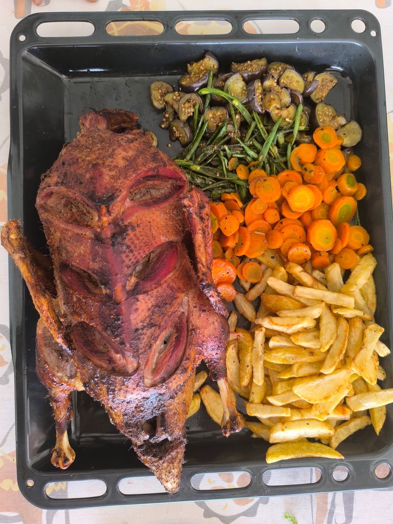 Ça dépend de la taille du canard, moi là je vais le mettre 2 heures a 200 degrés en le couvrant la moitié de la cuisson avec du papier alu et je remets le jus sur le canard avec une cuillère