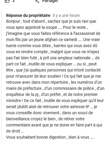 "Monsieur, la mort de votre fils n'est pas vaine, et vous pouvez servir votre pays en appelant au plus grand calme. Toute déclaration provocatrice risque d'embraser le pays. Votre fils, Monsieur est un Héro et VOUS devez lui rendre hommage