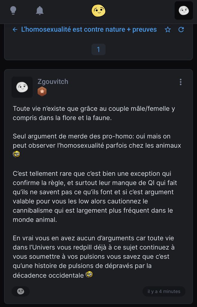 En quoi je deviens homophobe en disait la vérité sur l’homosexualité c’est pas parce que je ne suis pas un golem sur ce sujet que j’aurais la haine des homos et vais leur faire du mal bordel vous mélangez tout je suis juste contre l’homosexualité par raisonnement logique et est clairvoyant sur la dépravation que c’est