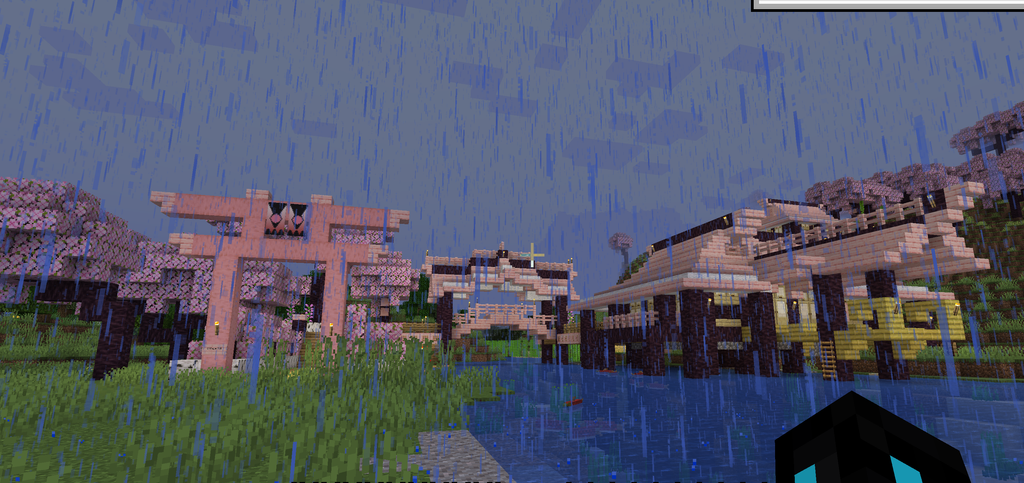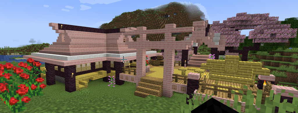 C'est donc un magnifique village qui bien qu'encore en construction est déjà très beau, il est situé dans un biome sakura et il est tout rose, il est également dans le style japonnais