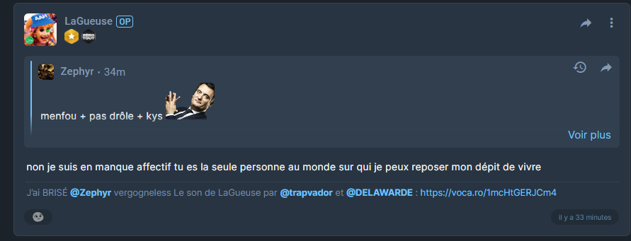 Y'a pas marqué OP a côté de ton nom moi si donc arrête de t'inventer une guerre de brisure ou je sais pas quoi contre moi je te connais pas