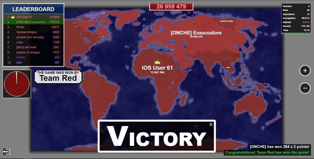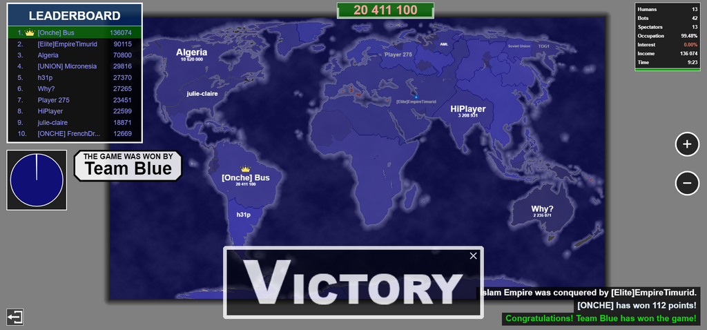 il avait full send ducoup j'arrive a prendre la moitié de son territoire mais la j'ai 100000 et ya 3 bot qui me full send en ayant 10 000 j'attaque le 1er bot avec 20k le deuxieme aussi je vois que ca fait rien et je l'ai rattaque de 20k et ils passent de 10 000 a 50 000