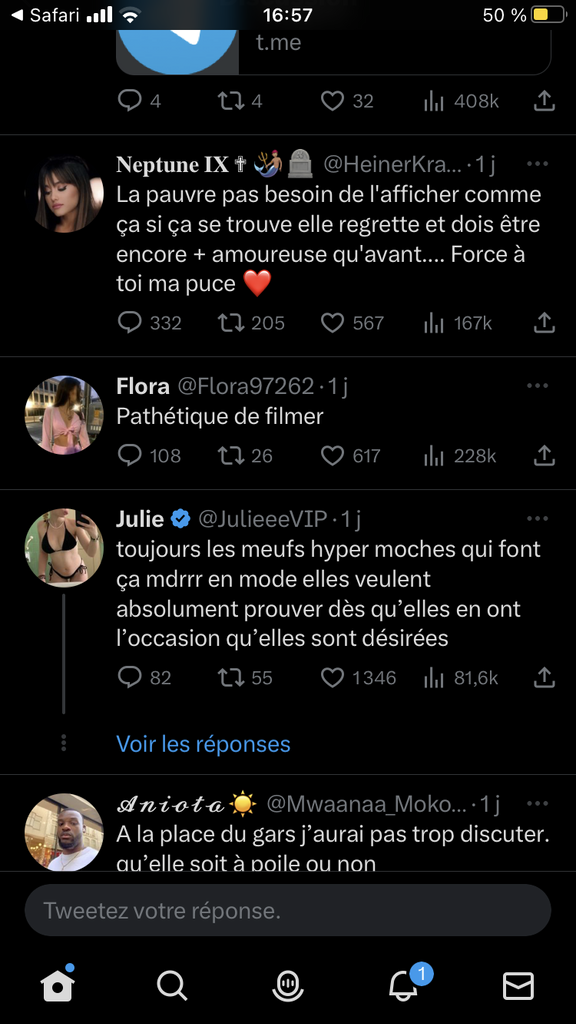« Ok certes elle trompe son mec, c’est pas bien et je ne vais pas la défendre mais on a pas le contexte de leur relation ni de la vidéo. Ça peut très bien être de la faute de son mec toxique, voilà comme d’habitude les incels de JVC qui n’ont jamais eu de relation vont se venger sur la meuf alors que le mec qui l’a filme est clairement il est en tort, il cherche à publiquement l’humilier et poster sans autorisation quelqu’un de nu sur internet, c’est fermement puni par la loi, ça s’appelle du revenge porn.