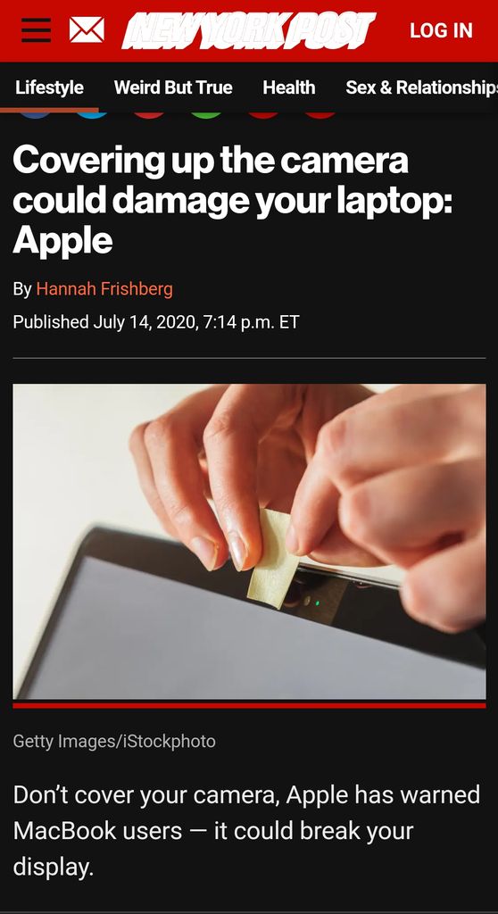 "Si vous fermez votre ordinateur portable Mac avec un cache d'appareil photo installé, vous risquez d'endommager votre écran car l'espace entre l'écran et le clavier est conçu selon des tolérances très strictes », a écrit Apple sur son site Internet. Les caches de caméra peuvent également interférer avec le capteur de lumière ambiante de la machine et empêcher les fonctionnalités, notamment la luminosité automatique et la technologie Retina Display True Tone d’Apple, de fonctionner correctement."