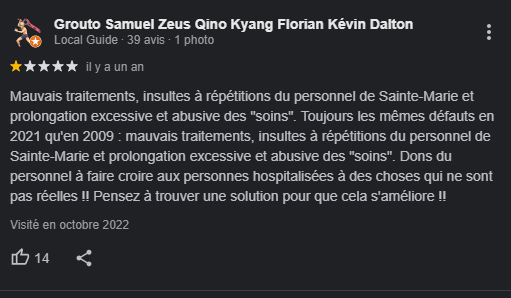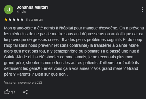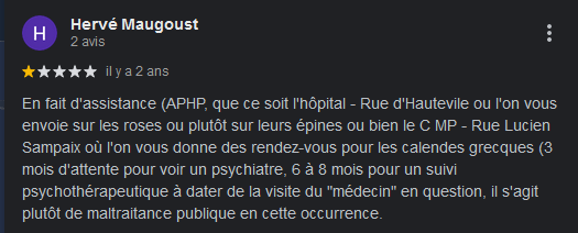 J'ai un avis Google incroyable sur ma supérette du village, le fait qu'elle soit en face d'un hp n'est sûrement pas étranger au caractère de l'avis