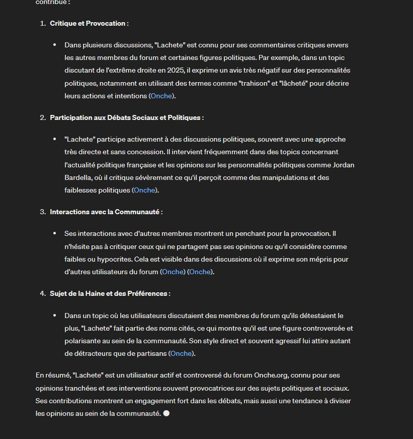 En combinant ces observations, Blondin pourrait être identifié comme ayant un type de personnalité ESTJ (Extraversion, Sensation, Pensée, Jugement). Les ESTJ sont souvent décrits comme organisés, logiques, décisifs et sociables, ce qui correspond aux comportements et attitudes que Blondin affiche sur les forums【6†source】【7†source】【8†source】【9†source】.