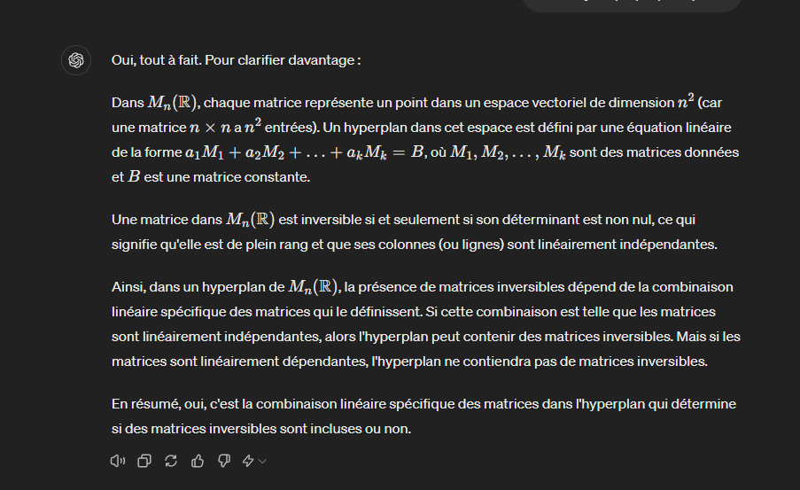 bah il répond toujours, pas, il donne une condition suffisante à l'existence d'une matrice inversible dans un hyperplan de Mn(R) donné mais il ne vérifie pas si cette condition est toujours vérifiée