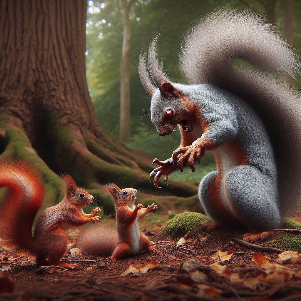 Fake, les écureuils gris n'attaquent que lâchement en groupe un écureuil roux isolé