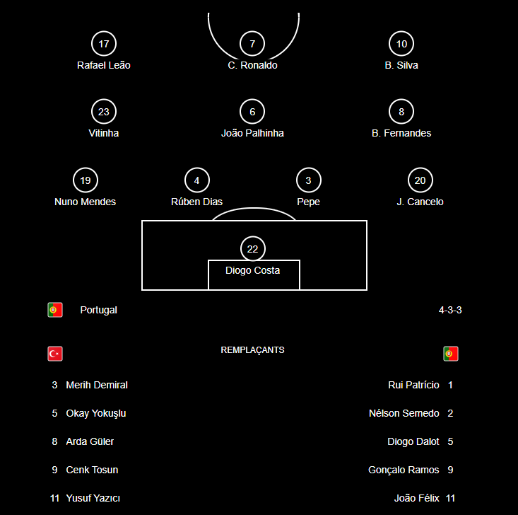 Portugal: Diego Costa - Nuno Mendes, Pepe, Dias, Cancelo - Fernandes, Palhinha, Vitinha - Leão, Ronaldo, Silva