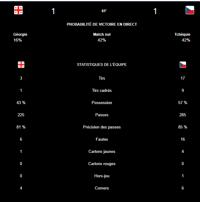 15 tirs, 3 cadrés avec Thuram. La Tchéquie fait 17 tirs et 9 cadrés.