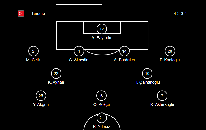 Turquie: Bayindir - Çelik, Akaydin, Bardakcı, Kadioglu - Kökçü, Çalhanoğlu, Ayhan - Akgün, Yilmaz, Aktürkoğlu