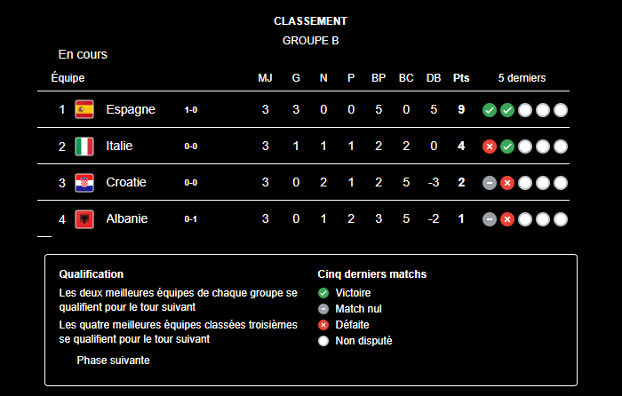 Si l'Albanie gagne contre l'équipe B de l'Espagne et que la Croatie gagne, les italiens sont dehors.