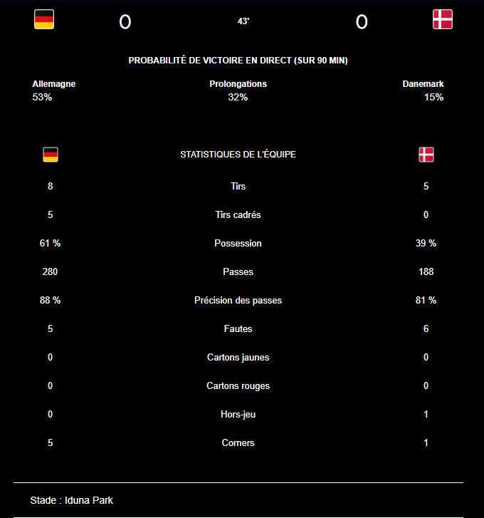 Le jeu est fermé, quasi pareil en nombre de fautes et le gardien danois qui arrive à parer les tirs allemands.